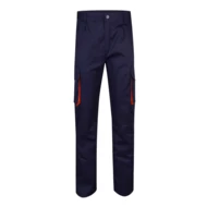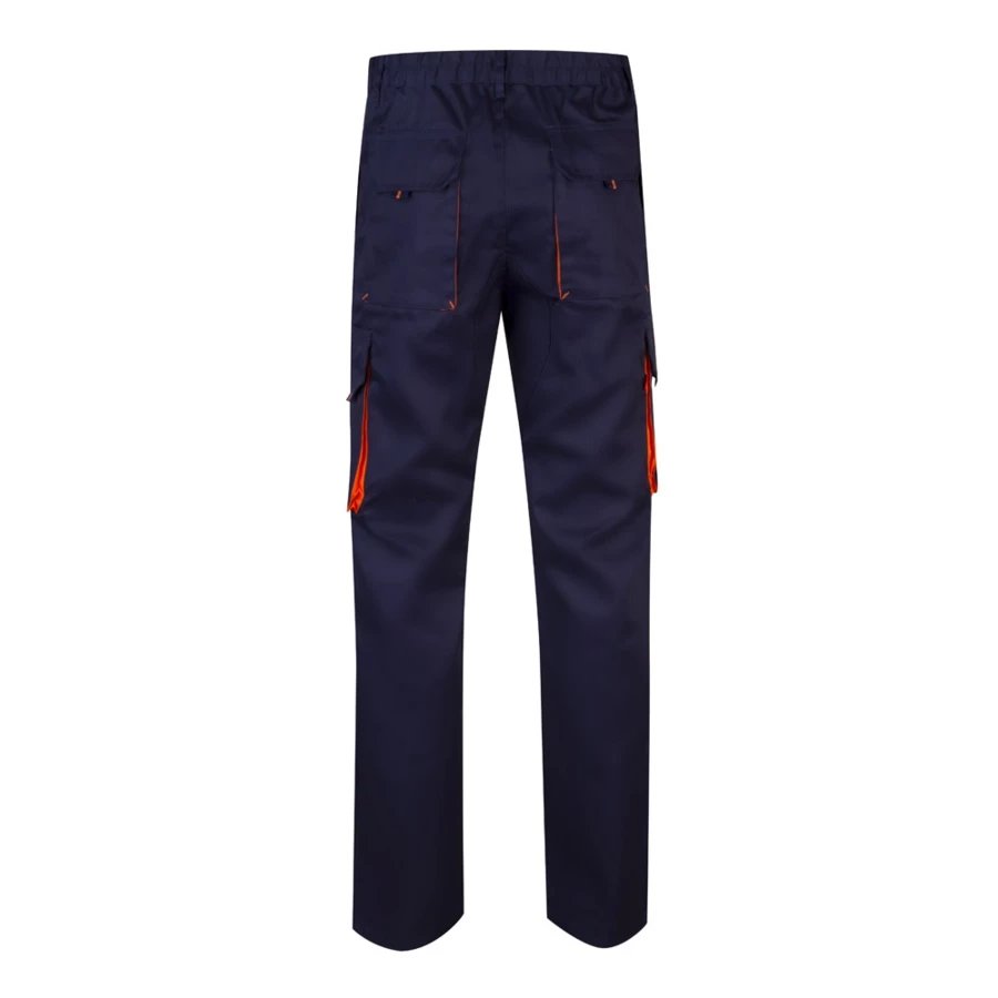 Dwukolorowe spodnie z wieloma kieszeniami o diagonalnym splocie (200g/m²), z bawełny (35%) i poliestru (65%). Z elastycznym pasem i kontrastowym kolorem klinów, ściągaczy i szwów. Zawiera sześć kieszeni: (2 kieszenie francuskie, 2 boczne kieszenie z klinem i 2 tylne kieszenie z klinem). Size: 34, 36, 38, 40, 42, 44, 46, 48, 50, 52, 54, 56, 58, 60