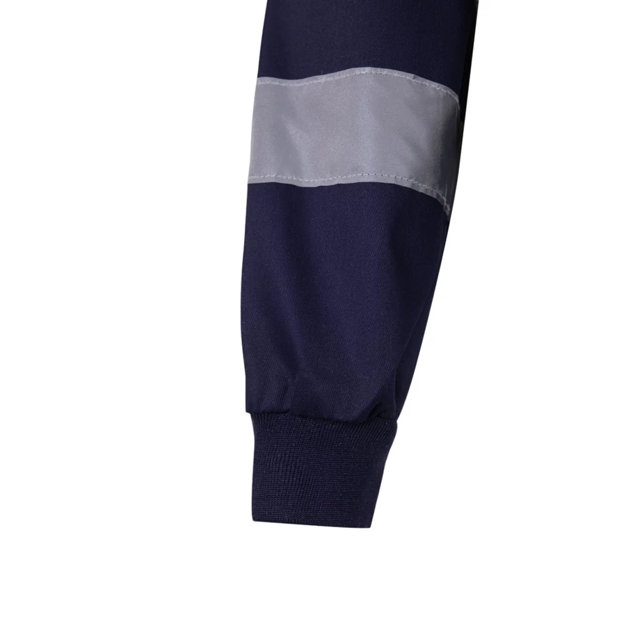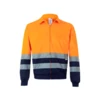 Dwukolorowa kurtka (210 g/m²) z poliestru (80%) i bawełny (20%). Centralny zamek błyskawiczny, elastyczny pas boczny i prążkowane mankiety. Odblaskowe paski na tułowiu i rękawach oraz dwie kieszenie na piersi z zamkiem błyskawicznym. Produkt zgodny z rozporządzeniem UE 2016/425, certyfikowany przez EN20471 i klasę Nº 2. Rozmiar: S, M, L, XL, 2XL, 3XL