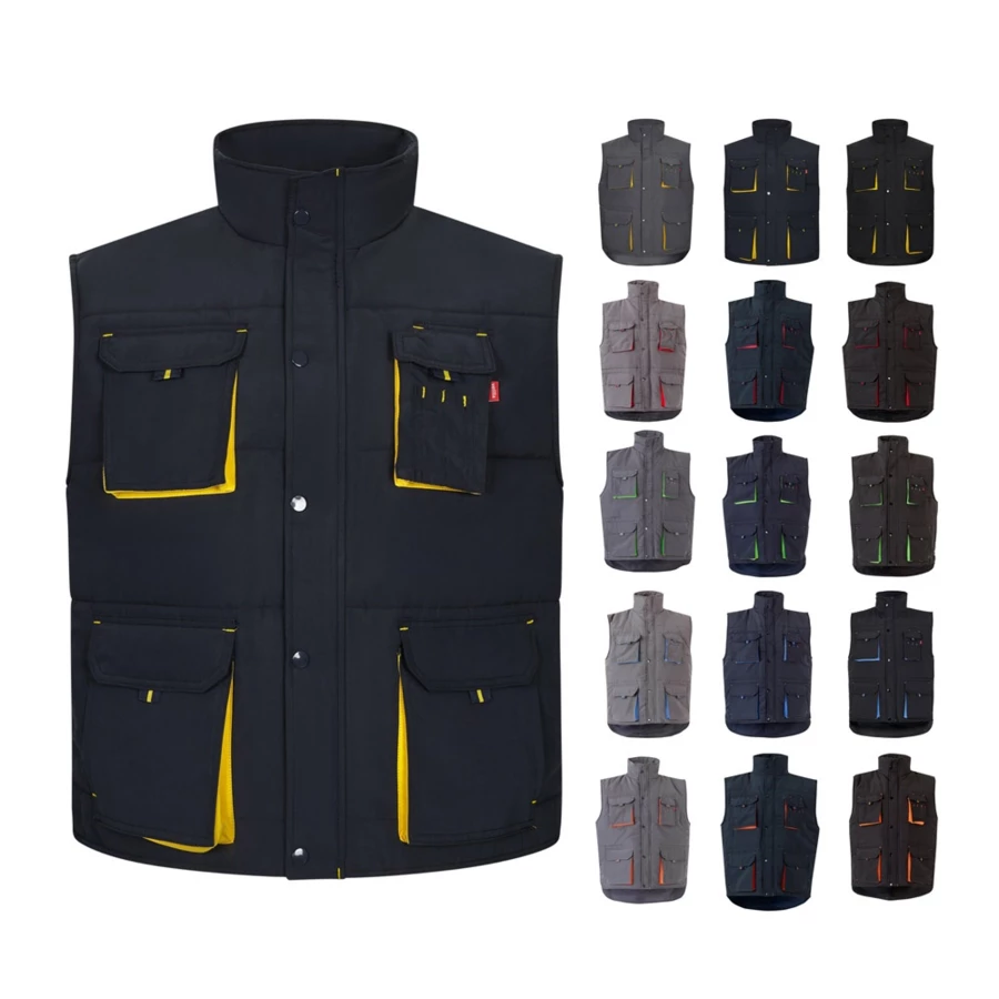 Dwukolorowa, pikowana kamizelka z wieloma kieszeniami (120 g/m²), wykonana z poliestru (100%). Zapięcie na zamek błyskawiczny, ukryte zapięcie na guziki. Elastyczny pas boczny, wiatrówka przy pachach. Mieszek, ściągacze i szwy w kontrastowym kolorze. Zawiera siedem kieszeni (2 kieszenie mieszkowe na klatce piersiowej, 2 dolne kieszenie mieszkowe, 2 kieszenie boczne, 1 kieszeń mieszkowa na klatce piersiowej i 1 kieszeń wewnętrzna). Rozmiar: S, M, L, XL, 2XL, 3XL