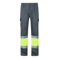 „Dwukolorowe spodnie z wieloma kieszeniami o diagonalnym splocie (210g/m²), wykonane z bawełny (20%) i poliestru (80%). Z gumką w pasie i odblaskowymi paskami u dołu spodni. Zawiera sześć kieszeni (2 francuskie, 2 boczne kieszenie mieszkowe i 2 tylne kieszenie mieszkowe). Produkt zgodny z rozporządzeniem UE 2016/425, certyfikowany przez EN20471 i klasę Nº 1. Rozmiar: S, M, L, XL, 2XL, 3XL