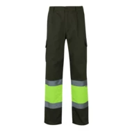 „Dwukolorowe spodnie z wieloma kieszeniami o diagonalnym splocie (210g/m²), wykonane z bawełny (20%) i poliestru (80%). Z gumką w pasie i odblaskowymi paskami u dołu spodni. Zawiera sześć kieszeni (2 francuskie, 2 boczne kieszenie mieszkowe i 2 tylne kieszenie mieszkowe). Produkt zgodny z rozporządzeniem UE 2016/425, certyfikowany przez EN20471 i klasę Nº 1. Rozmiar: S, M, L, XL, 2XL, 3XL