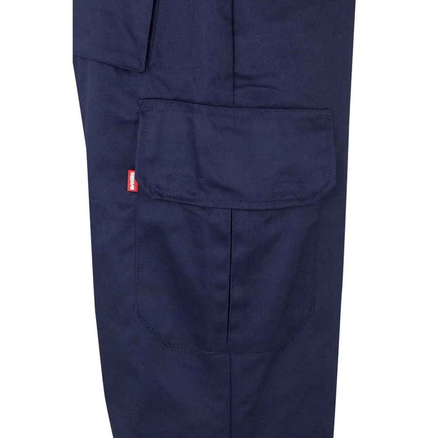 „Dwukolorowe spodnie z wieloma kieszeniami o diagonalnym splocie (210g/m²), wykonane z bawełny (20%) i poliestru (80%). Z gumką w pasie i odblaskowymi paskami u dołu spodni. Zawiera sześć kieszeni (2 francuskie, 2 boczne kieszenie mieszkowe i 2 tylne kieszenie mieszkowe). Produkt zgodny z rozporządzeniem UE 2016/425, certyfikowany przez EN20471 i klasę Nº 1. Rozmiar: S, M, L, XL, 2XL, 3XL