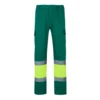 „Dwukolorowe spodnie z wieloma kieszeniami o diagonalnym splocie (210g/m²), wykonane z bawełny (20%) i poliestru (80%). Z gumką w pasie i odblaskowymi paskami u dołu spodni. Zawiera sześć kieszeni (2 francuskie, 2 boczne kieszenie mieszkowe i 2 tylne kieszenie mieszkowe). Produkt zgodny z rozporządzeniem UE 2016/425, certyfikowany przez EN20471 i klasę Nº 1. Rozmiar: S,M,L,XL,2XL,3XL