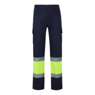 „Dwukolorowe spodnie z wieloma kieszeniami o diagonalnym splocie (210g/m²), wykonane z bawełny (20%) i poliestru (80%). Z gumką w pasie i odblaskowymi paskami u dołu spodni. Zawiera sześć kieszeni (2 francuskie, 2 boczne kieszenie mieszkowe i 2 tylne kieszenie mieszkowe). Produkt zgodny z rozporządzeniem UE 2016/425, certyfikowany przez EN20471 i klasę Nº 1. Rozmiar: S,M,L,XL,2XL,3XL
