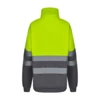 „Dwukolorowa bluza (300g/m²) z polaru poliestrowego (100%). Z wysokim kołnierzem i zamkiem do połowy. Prążkowane mankiety i dół. Odblaskowe paski na tułowiu i rękawach. Produkt zgodny z rozporządzeniem UE 2016/425, certyfikowany przez EN20471 i klasę Nº 1. Rozmiar: S, M, L, XL, 2XL, 3XL
