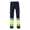 „Dwukolorowe, elastyczne spodnie z wieloma kieszeniami (240g/m²), wykonane z bawełny (46%), EME (38%) i poliestru (16%). Z gumką w pasie i odblaskowymi paskami u dołu spodni. Kontrastowy kolor na miechach, ściągaczach i materiale pomiędzy paskami odblaskowymi. Sześć kieszeni (2 kieszenie francuskie, 2 boczne kieszenie mieszkowe i 2 tylne). Produkt zgodny z rozporządzeniem UE 2016/425, certyfikowany przez EN20471 i klasę Nº 1. Rozmiar: S, M, L, XL, 2XL, 3XL
