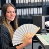 Papierowy wachlarz z drewnianą rączką, idealnie sprawdzi się w upalne letnie dni.