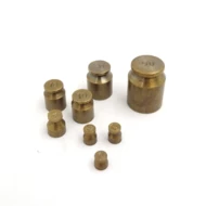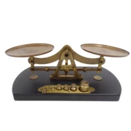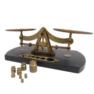 Waga wykonana z mosiądzu usytuowana na podstawie drewnianej. Na podstawie miejsce na odważniki. W zestawie 8 odważników do wagi szalkowej.
