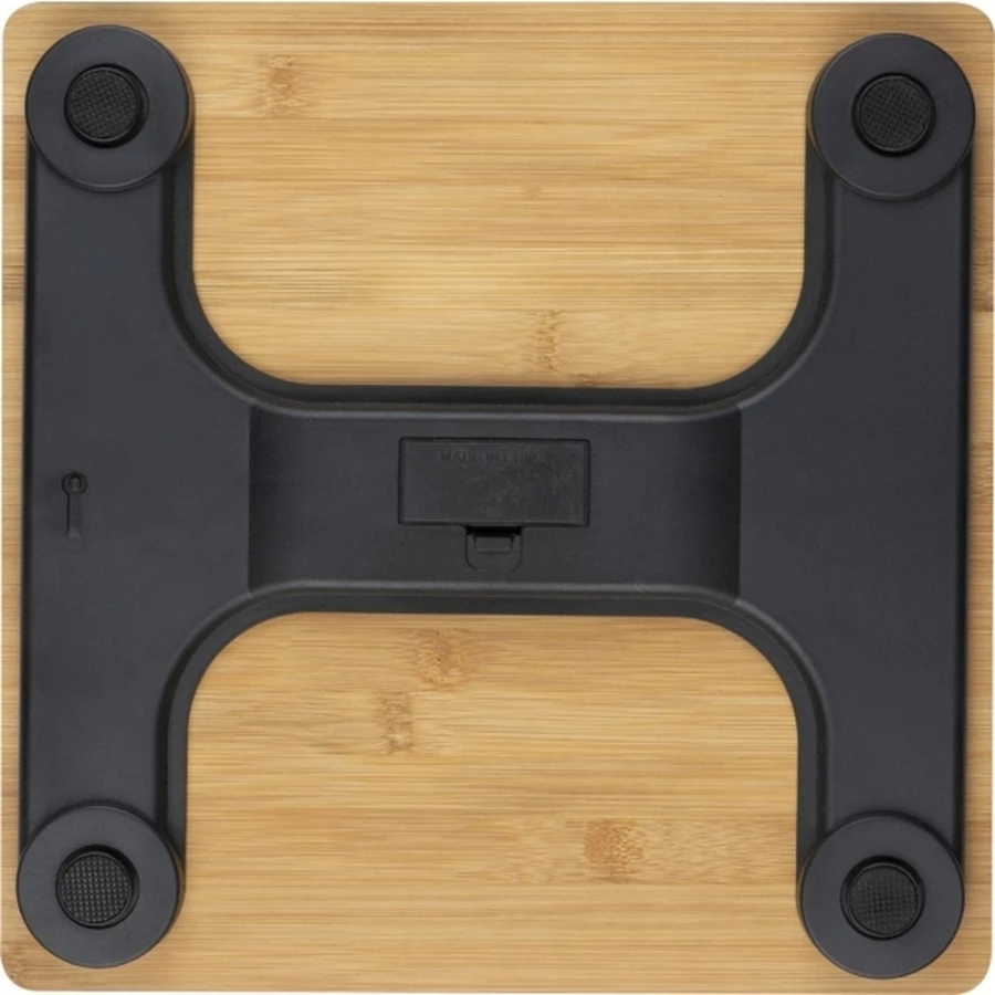 Cyfrowa waga łazienkowa z bambusową obudową. Maksymalne obciążenie 150 kg. Waga w zestawie bez baterii.