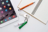 Plastikowa, mini latarka z 1 diodą LED, wykończeniem metalowym i metalowym brelokiem. Z baterią guzikową.