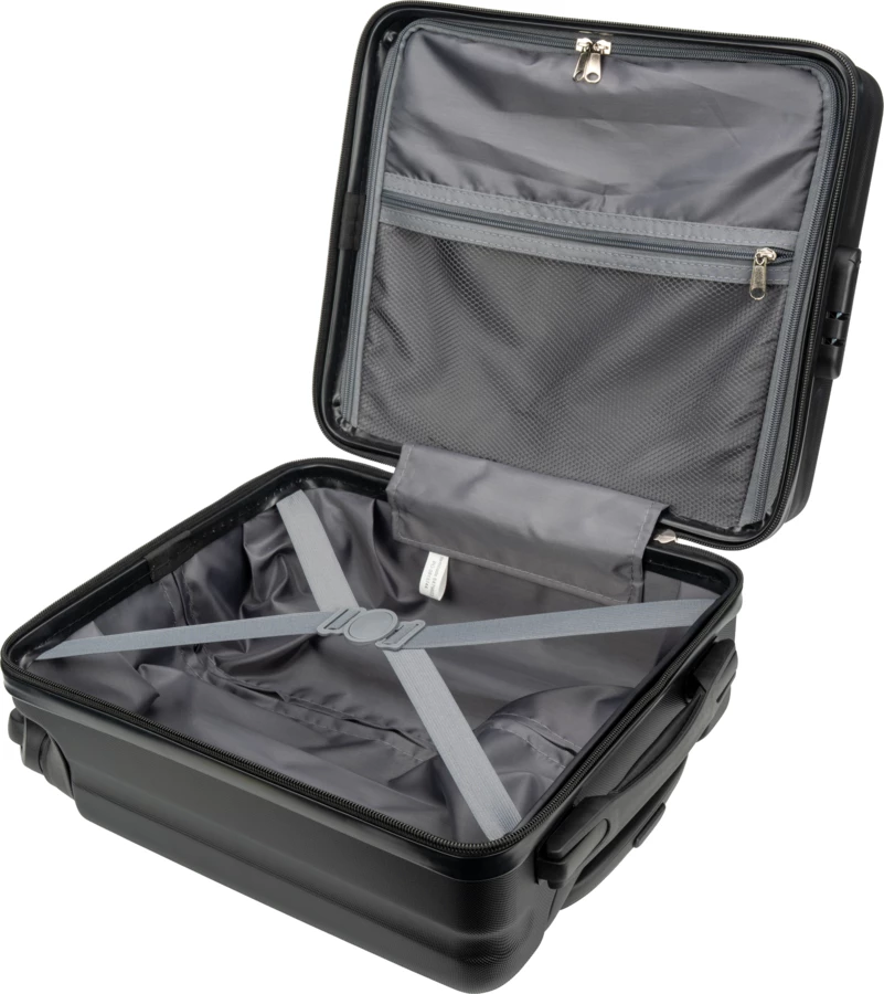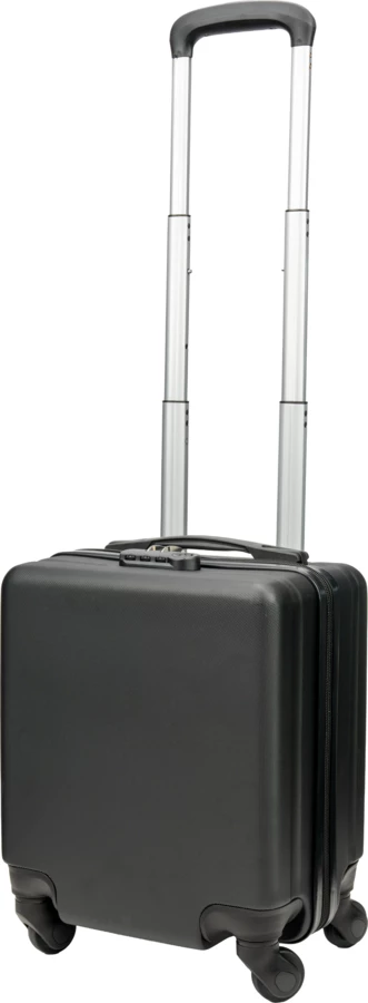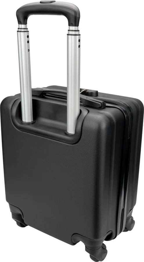 Czarna walizka na kółkach, która mieści się pod siedzeniem samolotu. Walizka posiada przegródkę na laptopa o wielkości 14 cali. Idelana na podróż służbową lub weekendowy wyjazd.