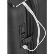 Podręczna walizka z przegrodą na laptopa Solidna, a zarazem niezwykle wygodna. Podręczna walizka Syntry to funkcjonalny model na kółkach gwarantujący doskonałą mobilność. Formowana pod ciśnieniem przednia przegroda stanowi bezpieczny schowek na laptopa i tablet, a poręczna kieszeń oferuje szybki dostęp do ważnych przedmiotów. Bezpieczeństwo zapewnia szyfrowy zamek i zapięcie na zamek błyskawiczny. Walizka jest też wyposażona w ładowarkę USB i zintegrowany moduł ID. Cztery superciche podwójne kółka ułatwiają poruszanie się, przyspieszając męczące przejście przez lotnisko.