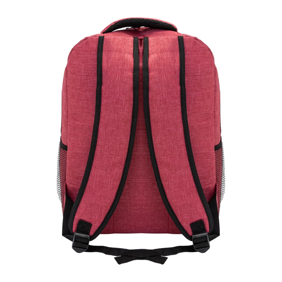 Plecak z zapinanymi kieszeniami, wzmocnionymi plecami, regulowanymi paskami i miejscem na laptop (15"). Materiał 600D poliester.