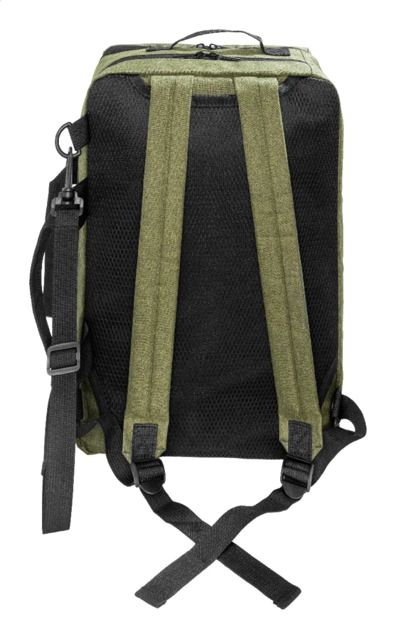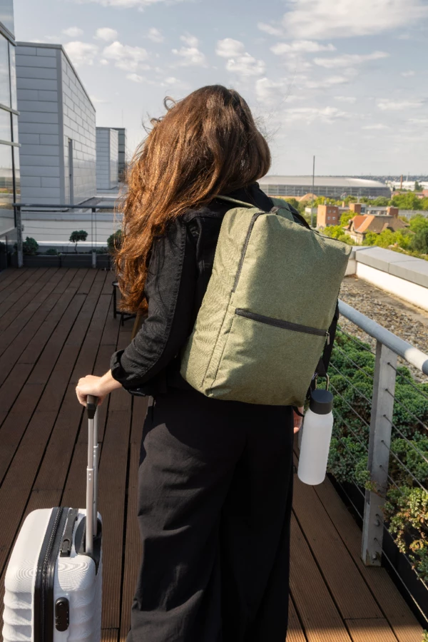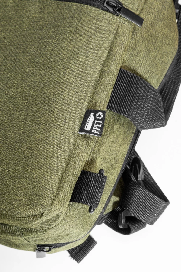 2 w 1 - plecak z RPET i torba na dokumenty z przegrodą na zamek błyskawiczny, 2 kieszeniami z przodu na zamek błyskawiczny i wyściełaną przegrodą na laptopa (15"). Z wyściełanymi plecami i paskami na ramię. W zestawie dodatkowy, odpinany pasek na ramię do użytku jako torba na dokumenty. Poliester 600D RPET, z charakterystyczną metką RPET.
