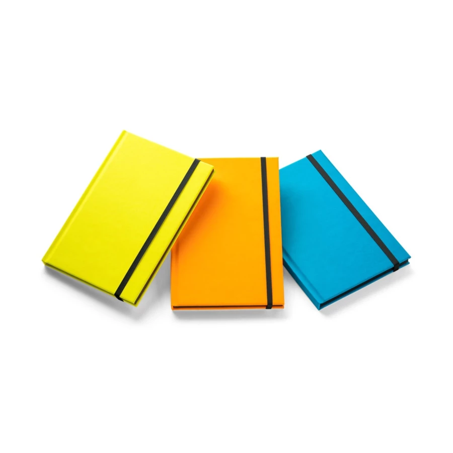Notes A5 w twardej oprawie, wykonanej z fluorescencyjnego PU. Posiada 192 białe strony (70 g/m²) w linie z czarnymi brzegami, zakładkę ze wstążki i gumkę. 140 x 210 mm