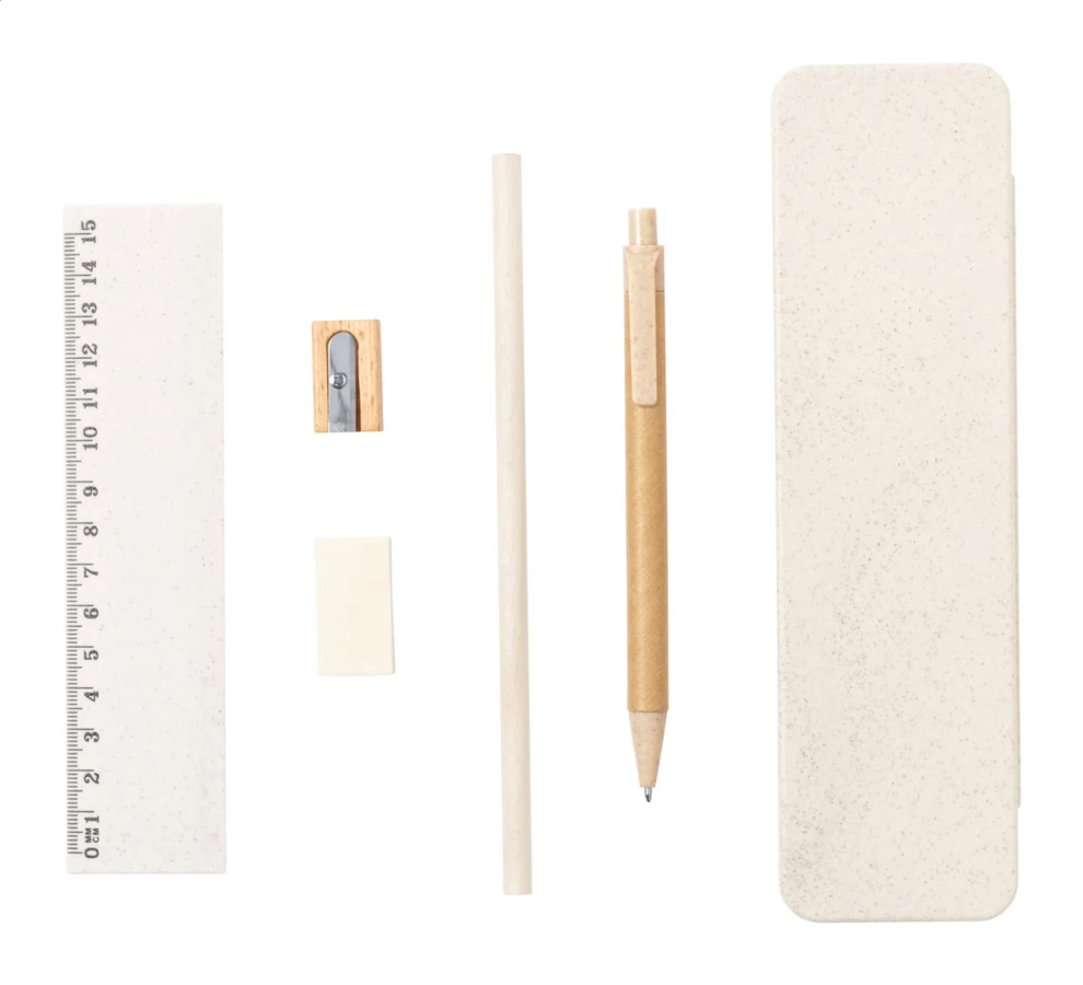 5-częściowy zestaw piśmienniczy w ekologicznym plastikowym pudełku ze słomy pszennej. Zawiera drewniany ołówek, papier z recyklingu i plastikowy długopis ze słomy pszennej z niebieskim wkładem, linijkę 15 cm, drewnianą temperówkę i gumkę.