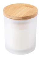 Świeca zapachowa (waniliowa) w szklanym słoju z bambusową pokrywką.