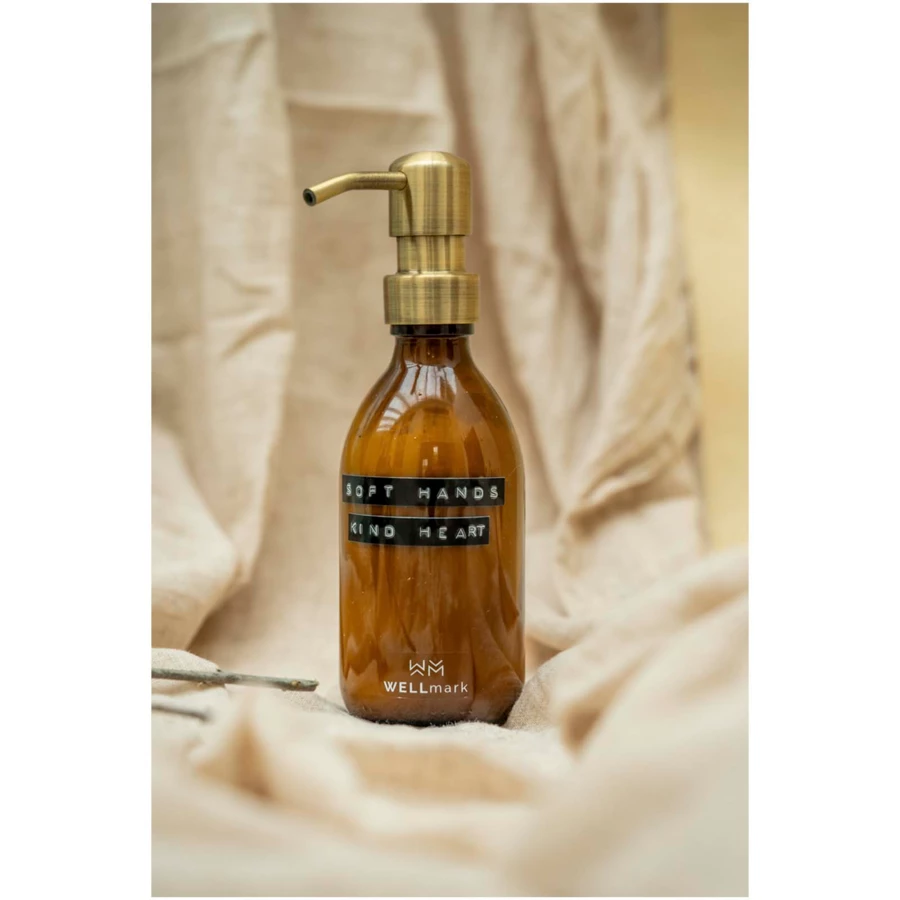 Stylowy szklany dozownik (250 ml) do łazienki, kuchni lub toalety. Ten luksusowy dozownik jest dostarczany z wegańskim kremem do rąk o przyjemnym zapachu bambusa, który oczyszcza i pielęgnuje dłonie. Piękne brązowe szkło w połączeniu z mosiężną pompką i tekstem "Soft hands kind heart" stanowi doskonałe dopełnienie każdego wnętrza. Po opróżnieniu dozownik można łatwo napełnić. Wyprodukowano w Holandii.