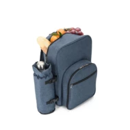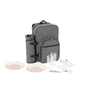 Termiczny plecak piknikowy wykonany z 600D poliestru o wysokiej gęstości pochodzącego z recyklingu. Przestronna komora główna i wyjmowana kieszeń na butelkę, obie z izolacją PEVA. Przednia kieszeń zawiera zastawę stołową dla 2 osób: 6 zestawów sztućców ze stali nierdzewnej (2 widelce, 2 noże i 2 łyżki), 2 talerze PS, 2 kieliszki PS i 1 korkociąg. Posiada boczną kieszeń z siatki. Kompletny plecak, dzięki któremu możesz zabrać ze sobą wszystko, czego potrzebujesz na lunch na świeżym powietrzu. Plecak: 280 x 390 x 200 mm | Kieszeń na butelkę: ø105 x 300 mm