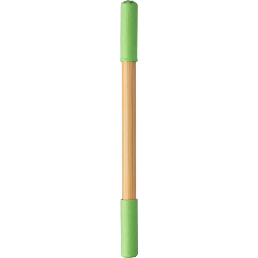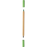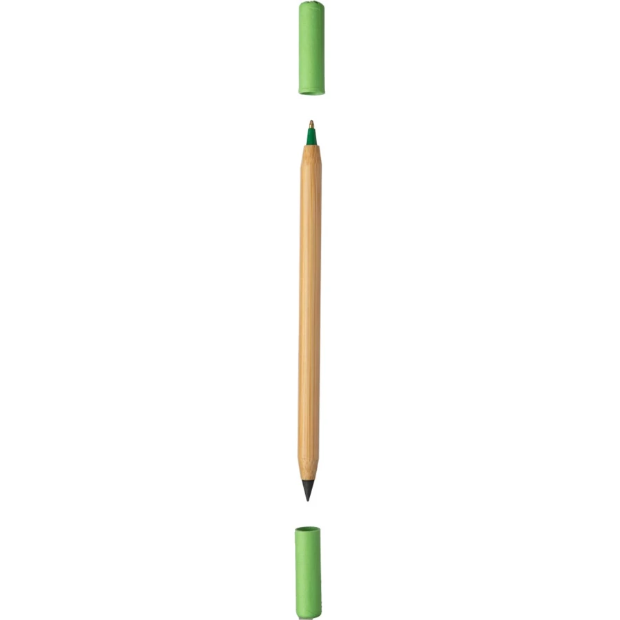 "Wieczny" ołówek i długopis w jednym, wolnościerająca się końcówka ołówka powoduje jego dłuższe zużycie, posiada dwie kolorowe zatyczki z kartonu, produkt wykonany z bambusa