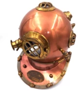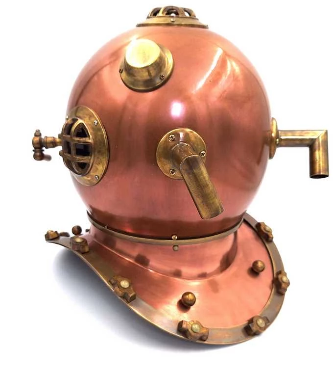 Oryginalny hełm nurka to idealna dekoracja do wnętrz w stylu industrialnym, loftowym i vintage. Wykonany z aluminium i żelaza w kolorze antycznej miedzi, jest wierną repliką modeli używanych przez nurków w latach 40. XX wieku. Hełm to również doskonały pomysł na prezent dla miłośników historii, nurkowania i osób ceniących oryginalne dodatki do wnętrz. Wysokość: 45cm.