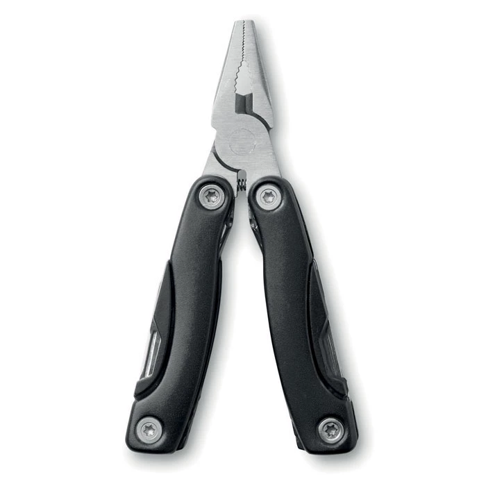 Składane narzędzie wielofunkcyjne ze stali nierdzewnej z kombinerkami. 9 funkcji. Pokrowiec z poliestru 600D.