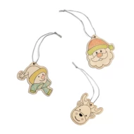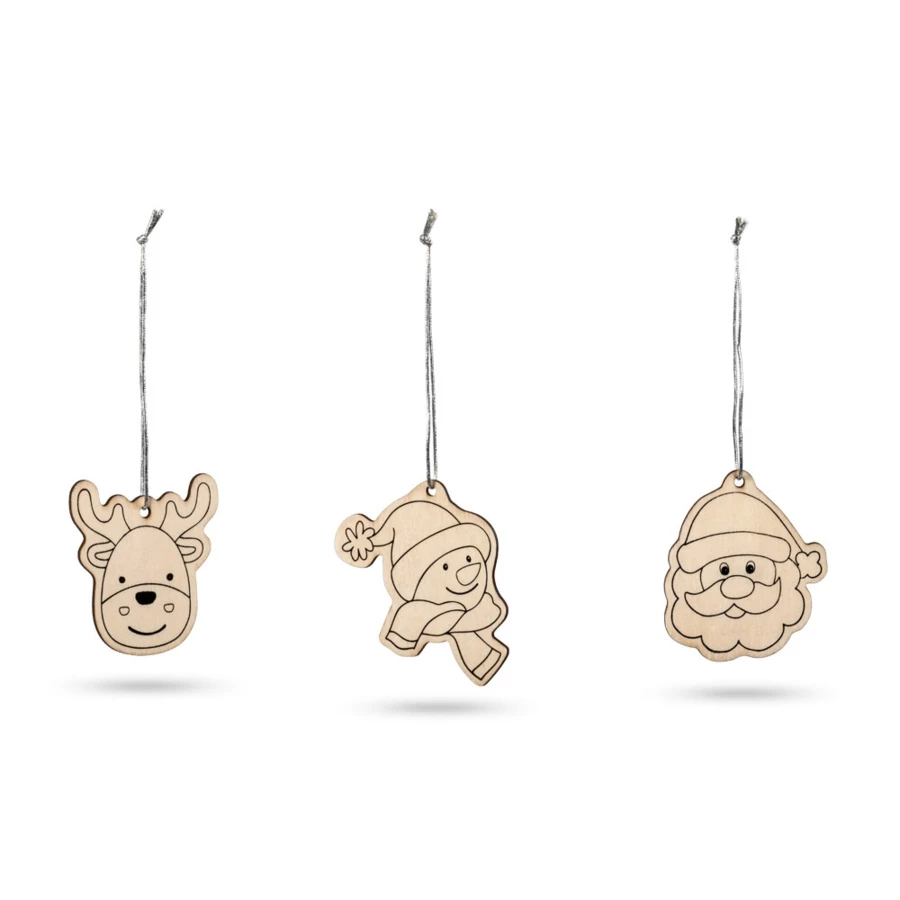 Zestaw do malowania na drewnie. Zawiera 3 świąteczne dekoracje z rysunkami do pomalowania, z wstążkami do powieszenia oraz 4 kolorowymi kredkami. Ponieważ produkt jest wykonany z naturalnych materiałów, kolor produktu oraz wynik drukowania mogą się różnić w zależności od produktu. 122 x 94 x 14 mm