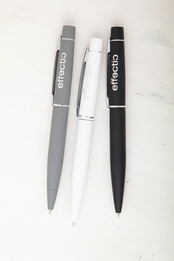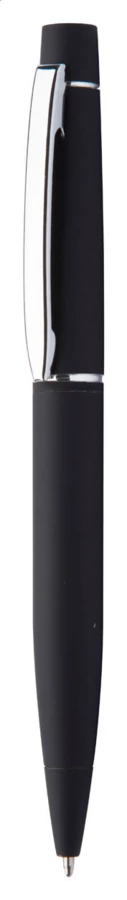 Metalowy długopis z gumowanym korpusem i niebieskim wkładem. Idealny pod grawer lustrzany.