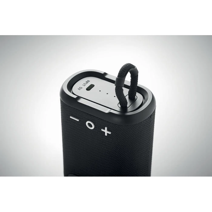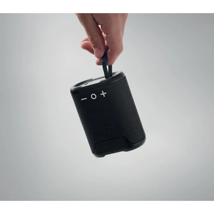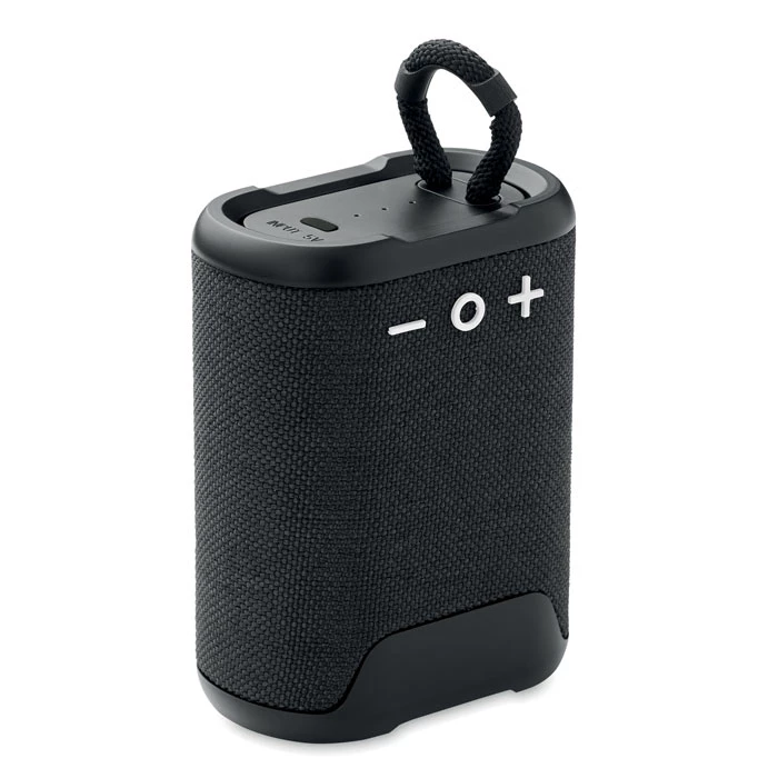 Bezprzewodowy głośnik 5.0 z tworzywa ABS z wykończeniem z 30% konopi i 70% poliestru, odporny na zachlapania IPX7, z uchwytem. 1 akumulator Li- Ion 1800 mAh. Dane wyjściowe: 5W, 4 Ohm. Czas odtwarzania ok. 8 godz.