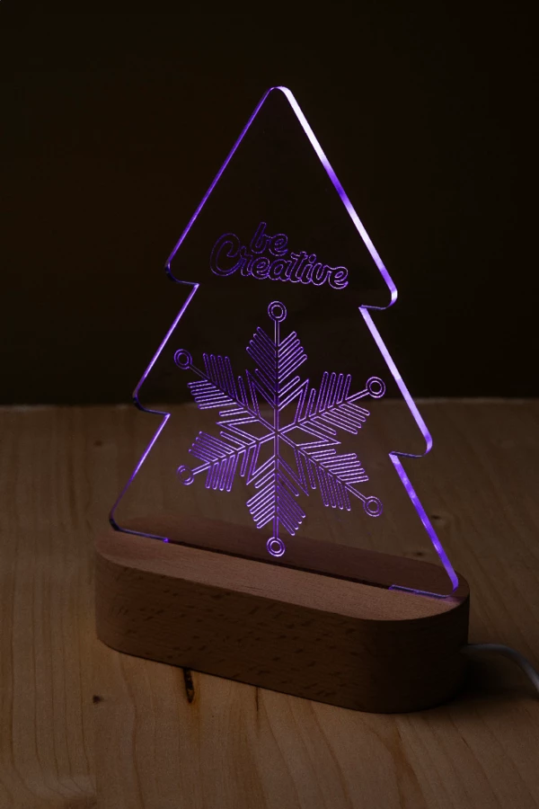 Wykonane na zamówienie, akrylowe trofeum w kształcie choinki na drewnianej podstawie, z wielokolorowym oświetleniem LED zasilanym przez USB. W zestawie kabel USB do ładowania. Cena zawiera grawerunek akrylowej choinki. Min. ilość: 25 szt.