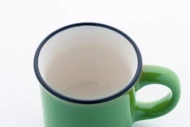 Miniaturowy, ceramiczny kubek vintage z czarną obwódką, biały w środku i kolorowy na zewnątrz, 90 ml. W pudełku z papieru typu kraft.