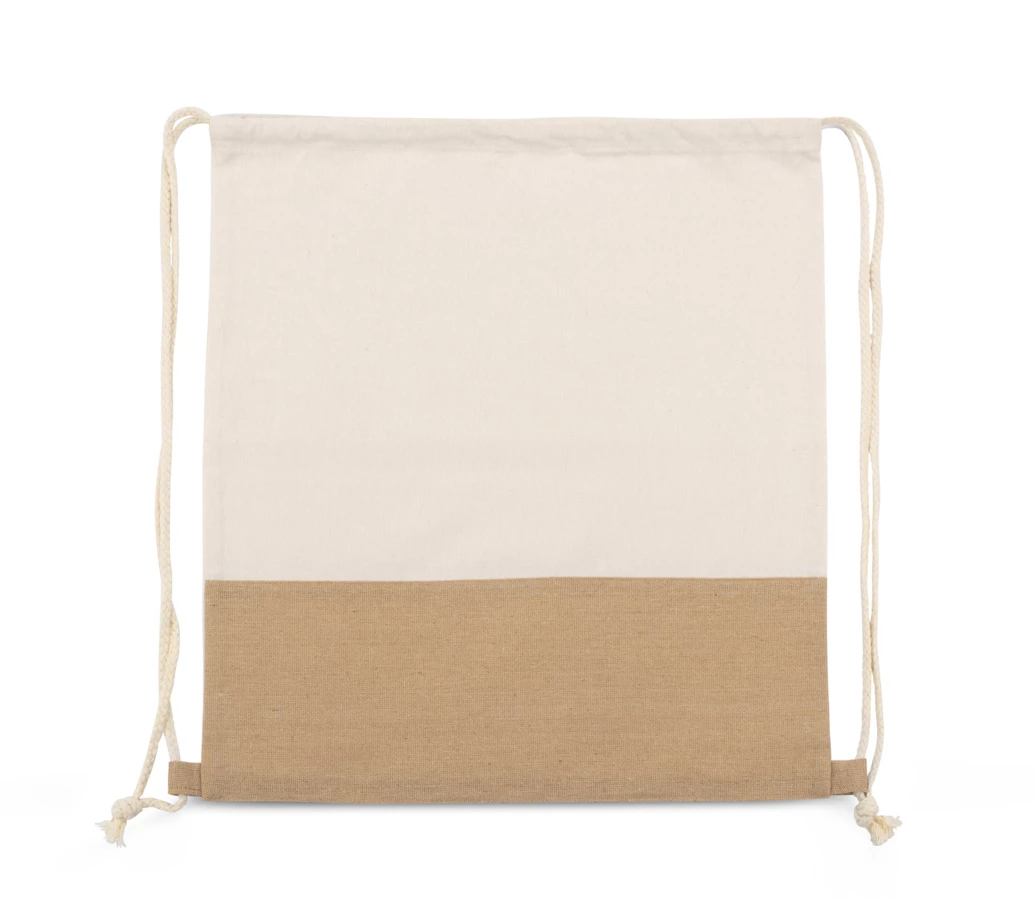 Worek JUTIK wykonany jest z bawełny (160g/m2) połączonej z materiałem podobnym do juty. Całość wygląda bardzo naturalnie i ciekawie. Worek jest jednokomorowy, zaciągany na bawełniane sznureczki.