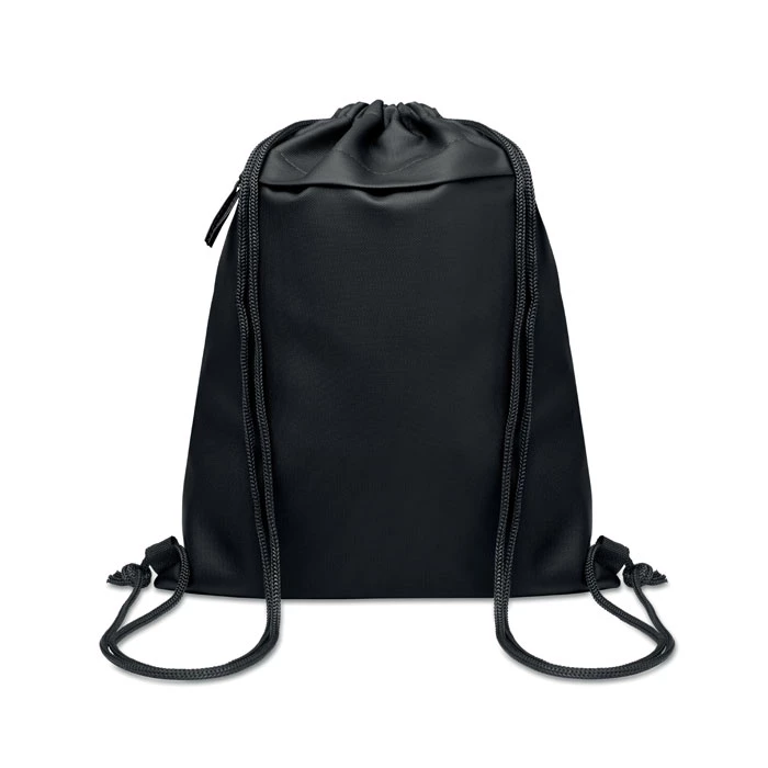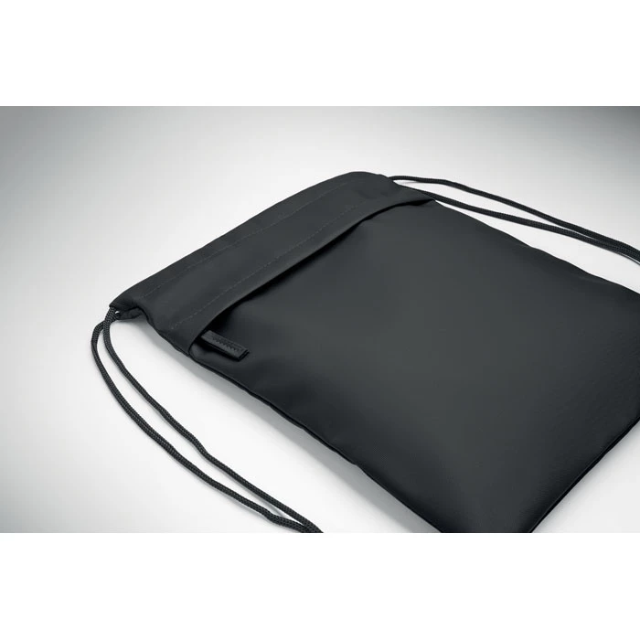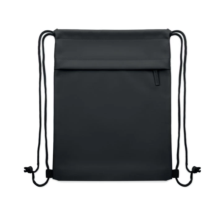 Worek ze sznurkiem powlekany PU, poliester 600D RPET, podszewka poliester 190T RPET. Przednia kieszeń zapinana na zamek.