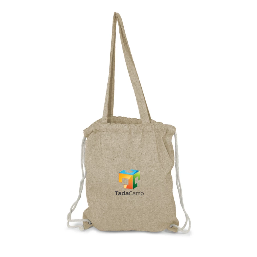 Worek ze sznurkiem i torba na zakupy 2 w 1, sznurki umożliwiają noszenie na plecach a długie uchwyty pozwalają nosić worek na ramieniu, pomieści drobne zakupy lub strój sportowy na siłownię, produkt wykonany z bawełny z recyklingu o gramaturze 140 g/m2