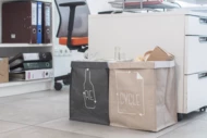 Zestaw dwóch worków wykonanych z myślą o możliwości segregacji i zachowaniu porządku. Zaprojektowane z minimalizmem, sprawdzą się nie tylko w biurze ale także w domu. Mają pomysłowy i autorski nadruk zaprojektowany specjalnie dla BLUE COLLECTION. Zakończone rzepem pozwalającym na złączenie obu worków. Wykonane z polipropylenu.
