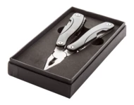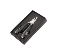 Wielofunkcyjne narzędzie ze stali nierdzewnej w czarnym opakowaniu.