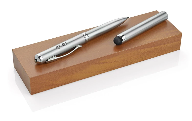 Wskaźnik laserowy z długopisem, końcówką dotykową touch i latarką. Pakowany jest w drewniane etui. Praktyczny i ładnie zapakowany będzie idealnym prezentem dla każdego menagera. Logo możemy wygrawerować na wskaźniku lub nadrukować na etui. Zgodnie z dyrektywą Unii Europejskiej (2006/25/EU) i Normą Polska ( PN-EN 60825-1:2014) wskaźnik posiada naklejkę informującą o niebezpieczeństiwe użytkowania.