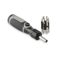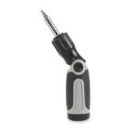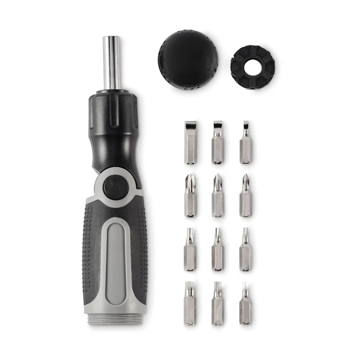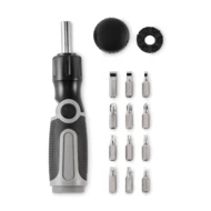 Wyginany śrubokręt z rękojeścią ABS w zestawie z 12 żelaznymi końcówkami, w tym krzyżakowymi, płaskimi, sześciokątnymi i torx.