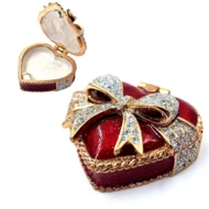 Piękne, bogato zdobione kryształkami pudełeczko na biżuterię w kształcie serca. Wymiary: 4,8 x 4 x 2,5 cm. Pomysł na romantyczny, ponadczasowy prezent.