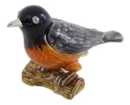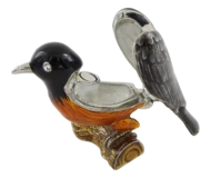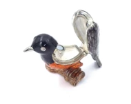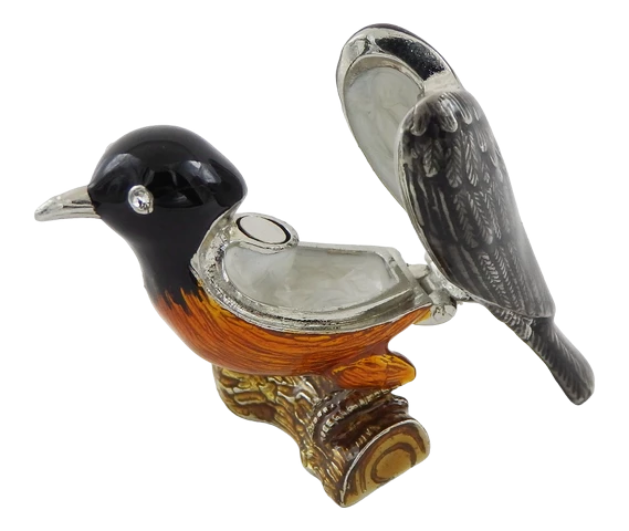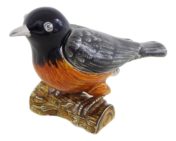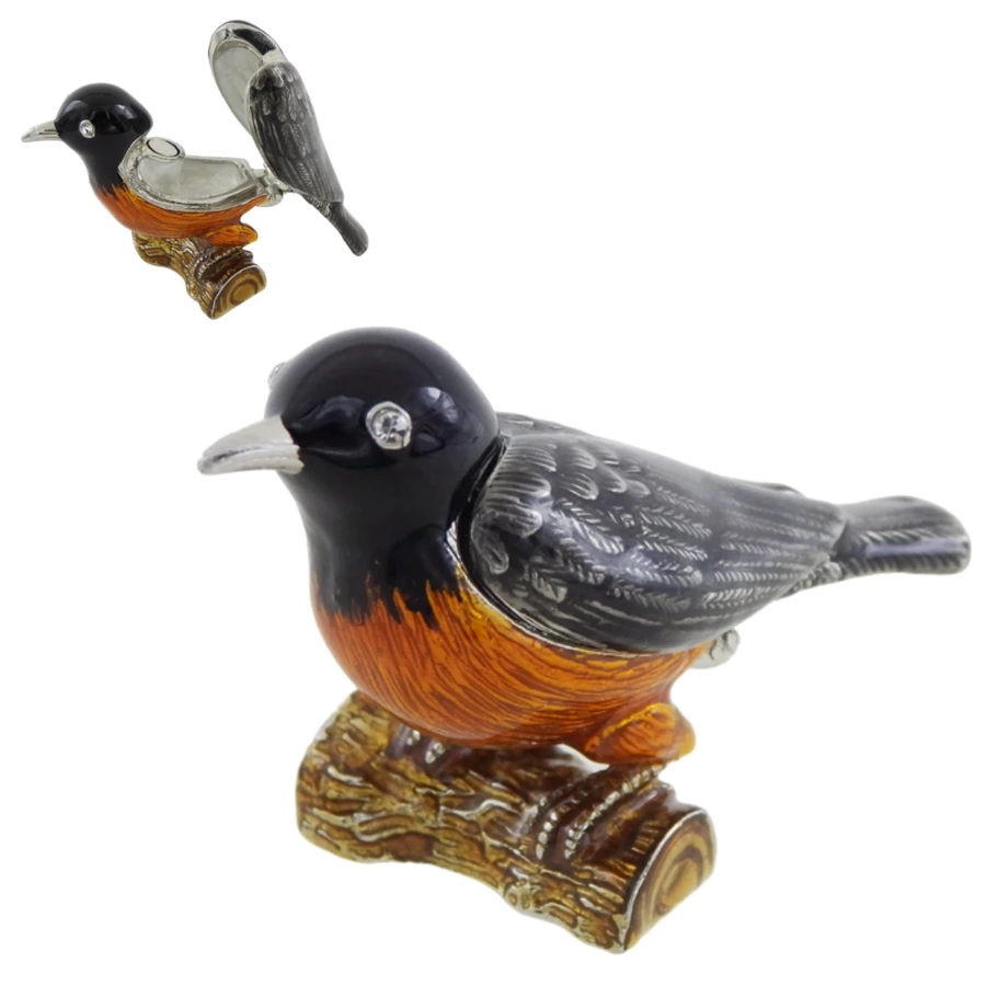 Eleganckie pudełko w kształcie ptaszka. Wymiary: 5x6x5cm. Materiał: metal, szkliwo, kryształ. Kolor: czarny, srebrny, brązowy, pomarańczowy.