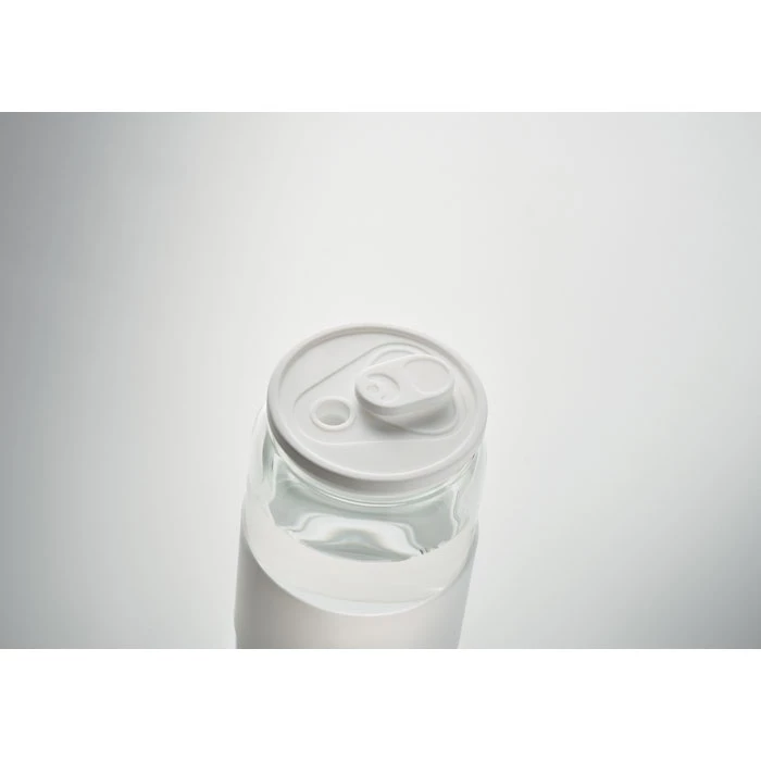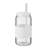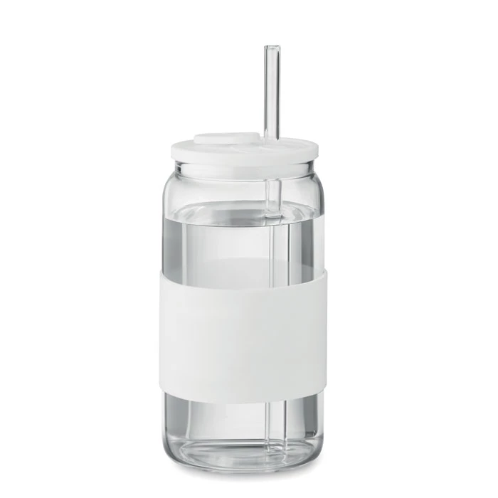 Wysoki kubek ze szkła borokrzemowego z silikonową pokrywką i uchwytem. Zawiera słomkę ze szkła borokrzemowego. Pojemność: 550 ml.