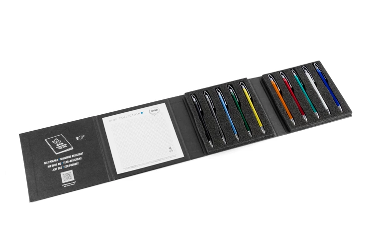 Będzie idealnym materiałem do prezentacji, dzięki umieszczonemu wewnątrz notesowi z papieru kamiennego da możliwość jednoczesnego przetestowania długopisów.