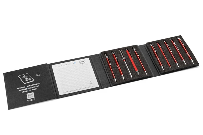 Będzie idealnym materiałem do prezentacji, dzięki umieszczonemu wewnątrz notesowi z papieru kamiennego da możliwość jednoczesnego przetestowania długopisów.