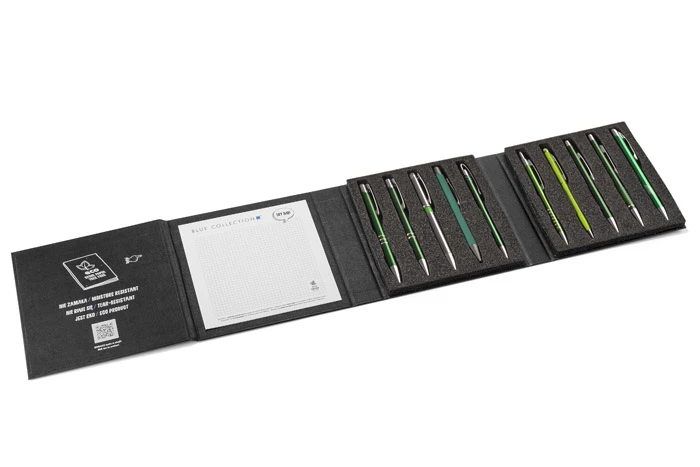 Będzie idealnym materiałem do prezentacji, dzięki umieszczonemu wewnątrz notesowi z papieru kamiennego da możliwość jednoczesnego przetestowania długopisów.