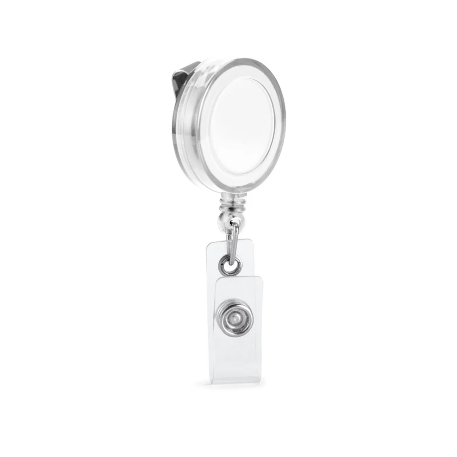 Badge do identyfikatora z metalowym klipsem z możliwością przedłużenia do 900 mm. Posiada przezroczysty klips i przycisk do dodania etui na kartę. Wysuwany mechanizm umożliwia bezpieczne i wygodne okazanie karty. ø32 x 9 mm