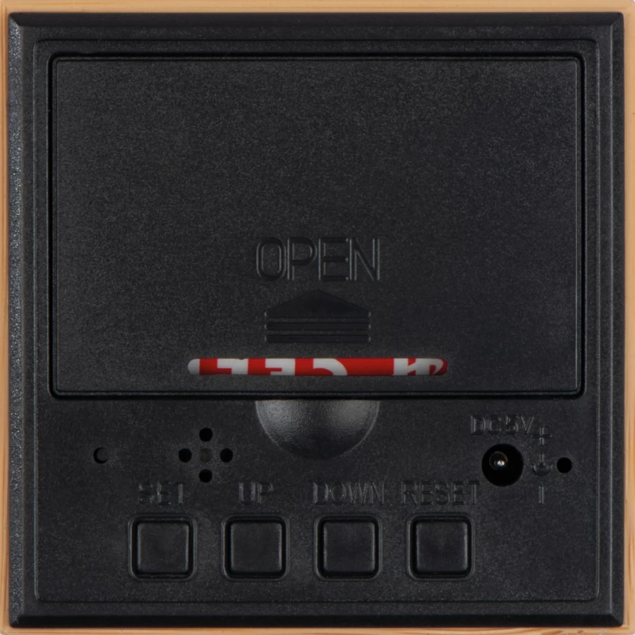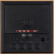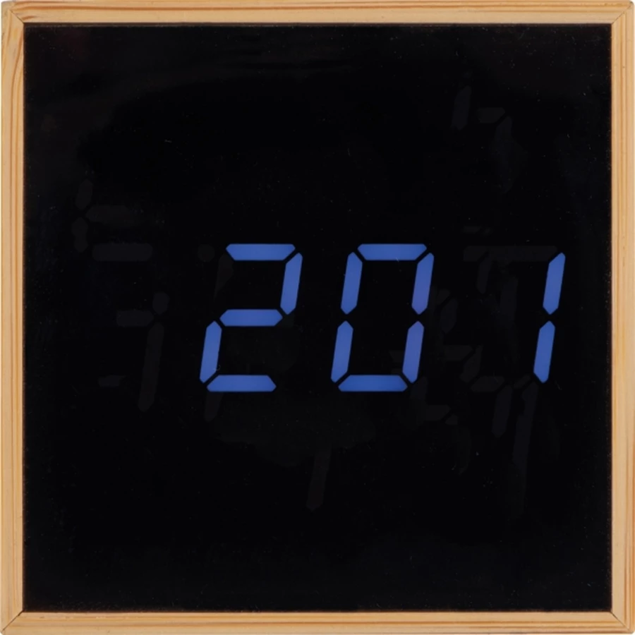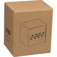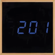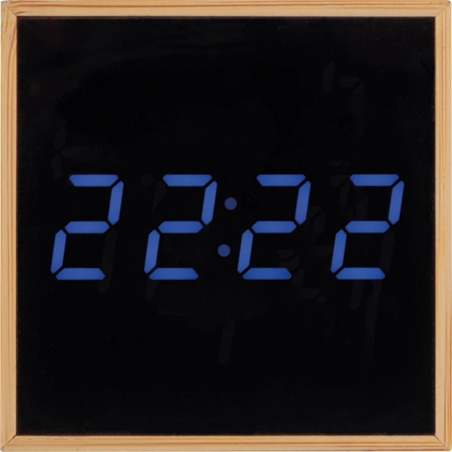Zegar w drewnianej obudowie z czarnym wyświetlaczem LED (cyfry wyświetlają się na niebiesko). Pokazuje godzinę, temperaturę i datę. Zegarek jest zasilany na 3 baterie AAA. Baterie nie są dołączone do zestawu.
