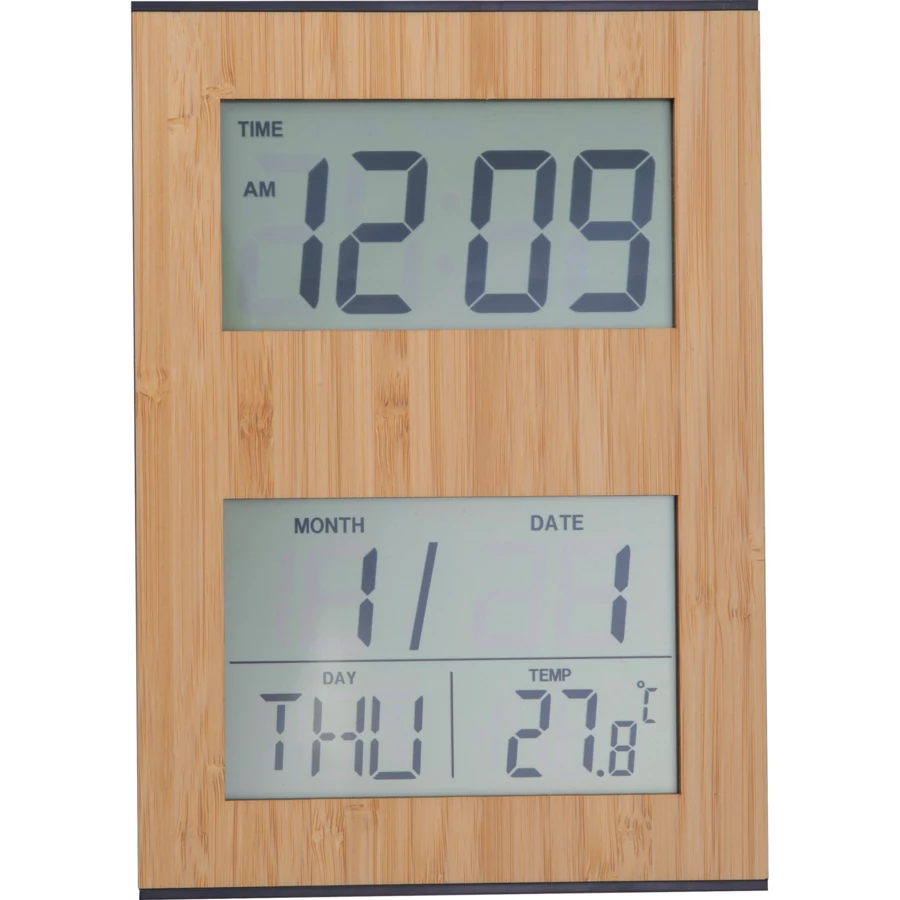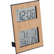 Zegar na biurko z wyświetlaczem czasu, daty oraz temperatury. Front obudowy wykonany z bambusa, który doskonale komponuje się z każdym biurkiem lub stolikiem nocnym.
