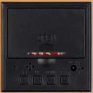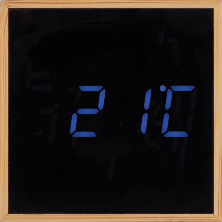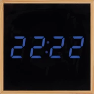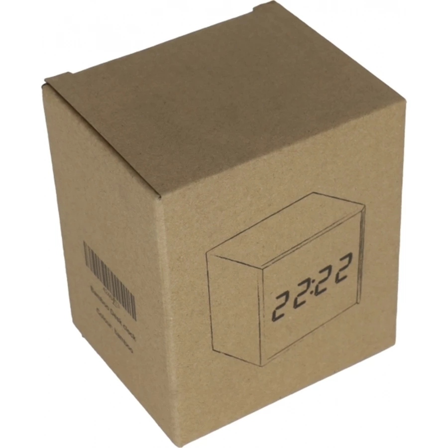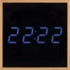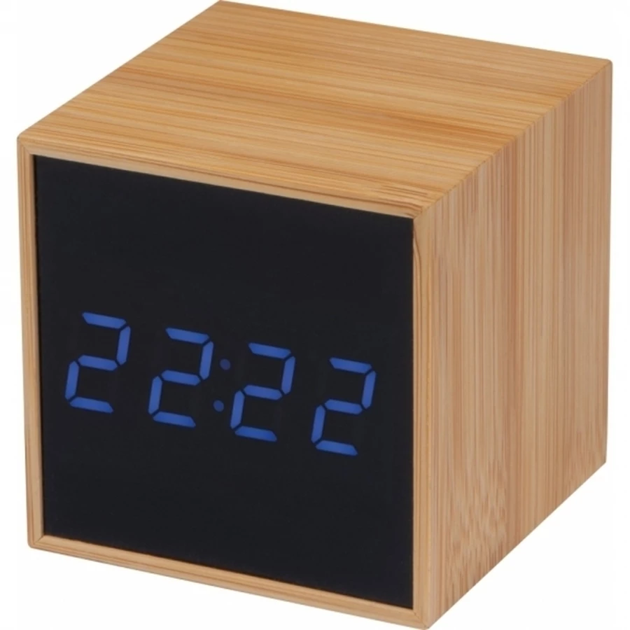Elegant desk clock with wooden casing, black display and blue LED display showing time, date and temperature alternately. We will engrave your logo on the top.