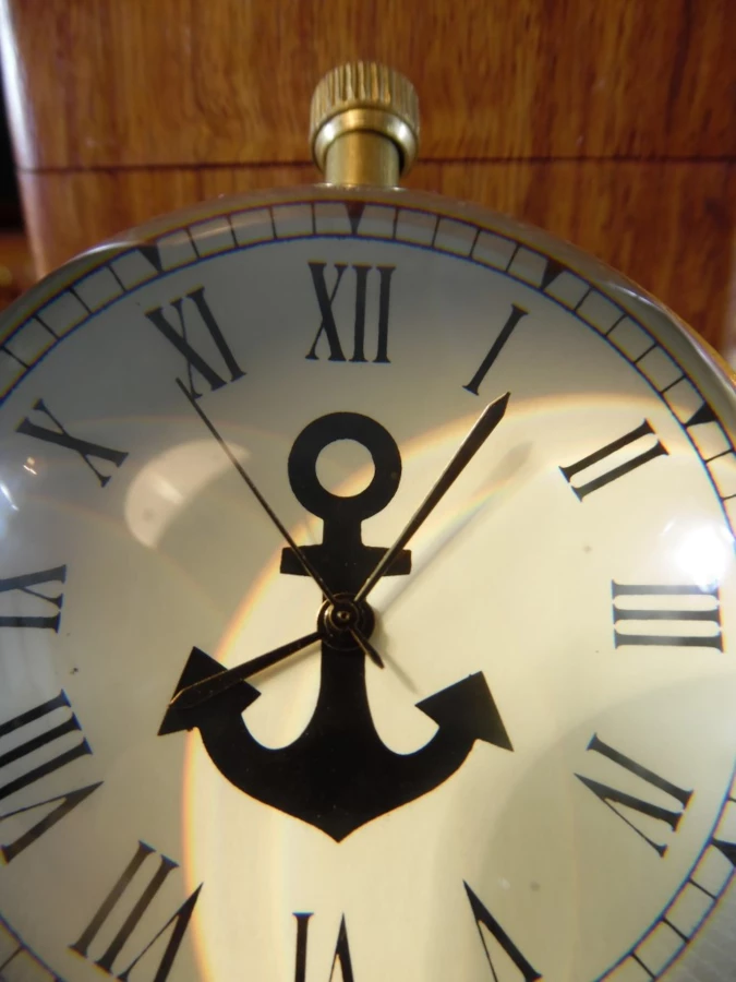 Mały, zgrabny zegar w obudowie mosiężnej to świetny element dekoracyjny wnętrz w stylu marynistycznym i retro. Sprawdzi się jako zegar na biurko lub dekoracja kominka. Na tarczy zegara w samym centrum znajduje się kotwica, która podkreśla żeglarski charakter czasomierza. Cyferblat jest biały z czarnymi cyframi rzymskimi w stylu retro. Dzięki soczewkowemu szkłu powierzchnia cyferblatu zdaje się być w delikatnym przybliżeniu. Zegar utrzymany jest w eleganckich kolorach: złotym, białym i czarnym. Pudełko wykonane jest z palisandru, na topie widnieje mosiężna kotwica. Zestaw iście marynistyczny! Doskonale sprawdzi się jako prezent dla żeglarza, marynarza lub podróżnika.