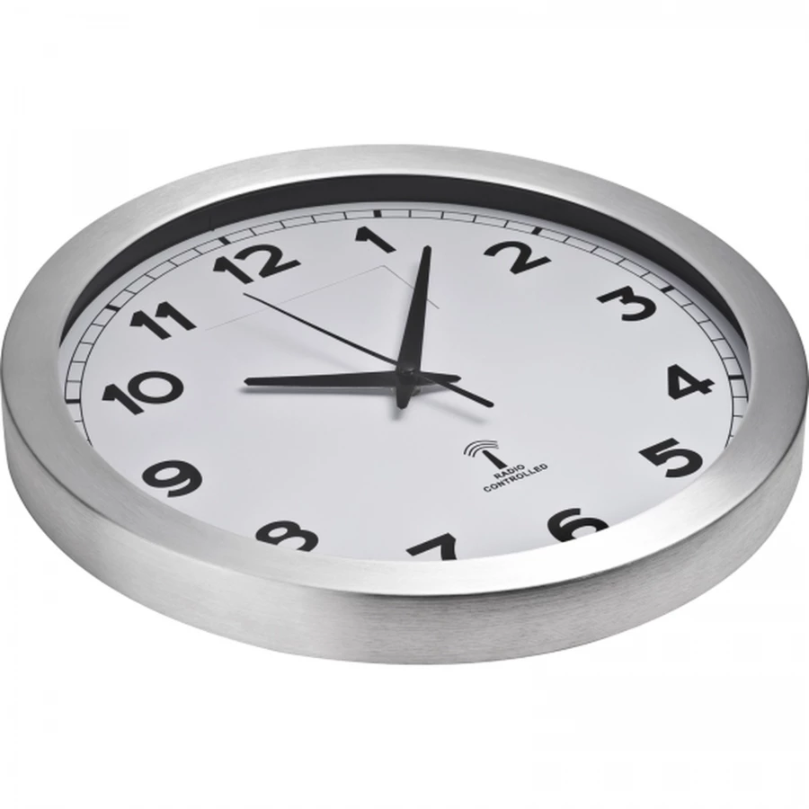 Duży zegar ścienny z metalu i szkła, sterowany radiowo. Zegar automatycznie ustawia godzinę - wystarczy włożyć baterie i nacisnąć przycisk reset.
